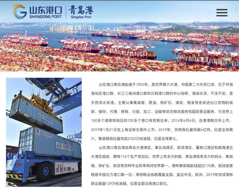 贝壳财经记者从青岛港官网看到,山东港口青岛港始建于1892年,是世界第六大港、中国第二大外贸口岸,位于环渤海地区港口群、长江三角洲港口群和日韩港口群的中心地带,港阔水深、不冻不淤,是天然深水良港。主要从事集装箱、原油、铁矿石、煤炭、粮食等各类进出口货物的装卸、储存、代理、保税、分拨、加工、运输等综合物流服务和国爱游戏中国官方网站际客运服务,与世界上180多个国家和地区的700多个港口有贸易往来。